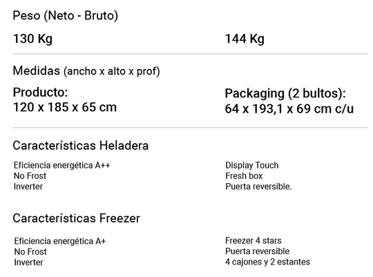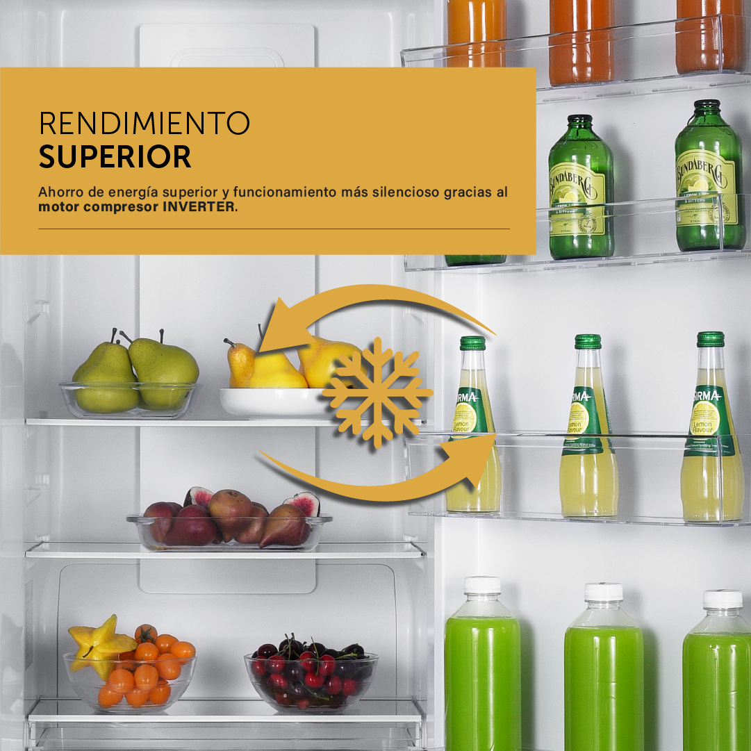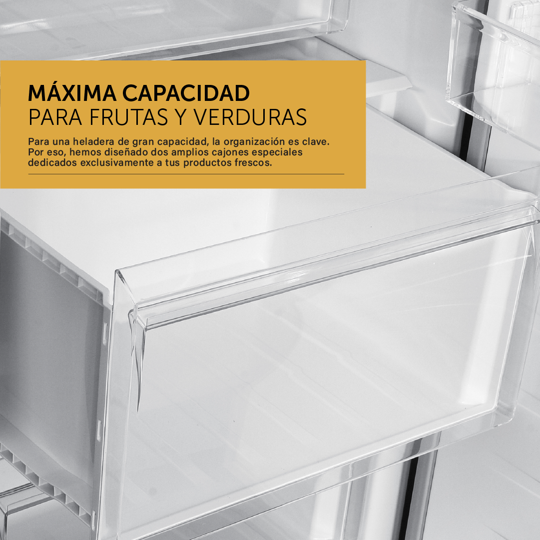 La heladera cuenta con Iluminación interior que permite ver con claridad cada rincón y un Display Touch intuitivo para controlar la temperatura y funciones. Su Fresh Box mantiene frutas y verduras frescas por más tiempo, preservando su sabor y textura.