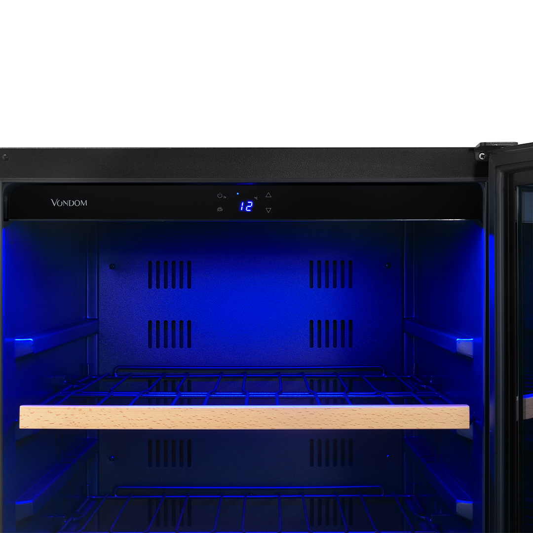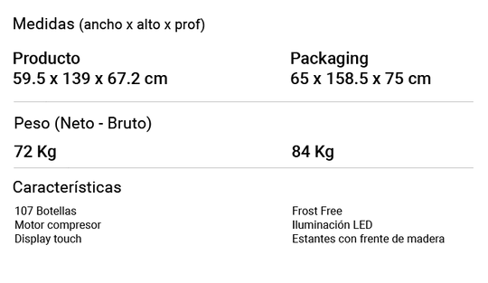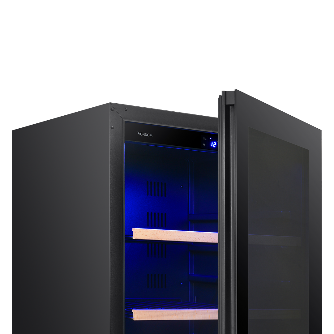 Su diseño empotrable se integra de forma elegante en tu cocina o espacio gourmet, mientras que los estantes con frente de madera aportan un toque cálido y sofisticado, realzando la experiencia visual de tu colección. La luz LED interior no solo resalta tus botellas, sino que crea una atmósfera única que transforma cada momento en algo especial.