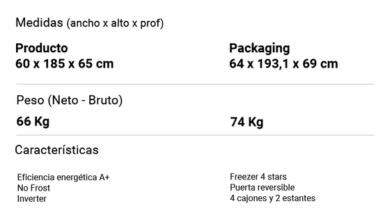 Su Eficiencia Energética A+ (Según la Resolución 438/2024, la clase A+ se actualizó a C, sin cambios en su consumo ni rendimiento real) permite reducir el consumo eléctrico, cuidando tanto tu economía como el medio ambiente. Gracias a la tecnología No Frost, evita la formación de escarcha, asegurando una temperatura uniforme en todo el interior y eliminando la necesidad de descongelar.