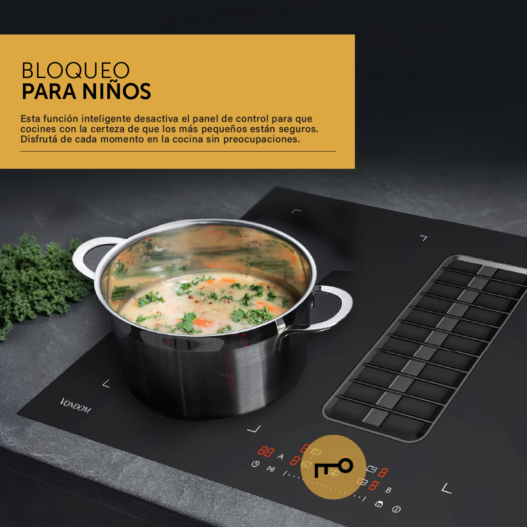 El confort se eleva con funciones diseñadas para tu tranquilidad: temporizador independiente para cada zona, indicador de calor residual, función pausa y bloqueo para niños, que hacen de la cocina un lugar seguro y confiable para toda la familia.
